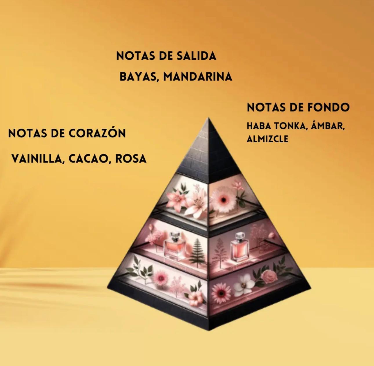 🌸Salida: frutos rojos, mandarina y un toque de azúcar — una apertura vibrante y jugosa que despierta la curiosidad. 🌸Corazón: vainilla, cacao, rosa y sutiles especias — un corazón envolvente que aporta profundidad, suavidad y calidez. 🌸Fondo: tonka, ámbar, almizcle y notas amaderadas — una base rica y duradera que deja una estela elegante y sofisticada.