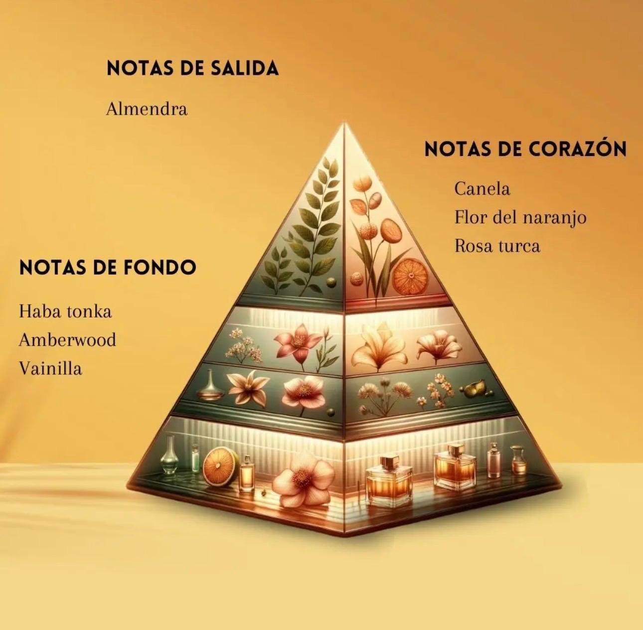 🌸 Notas de salida: Almendra (Almond) 🌸 Notas de corazón: Azahar tunecino (Tunisian Orange Blossom), rosa turca (Turkish Rose), corteza de canela (Cinnamon Bark) 🌸 Notas de fondo: Haba tonka (Tonka Bean), vainilla (Vanilla), madera de ámbar (Amberwood)