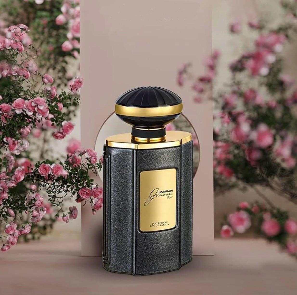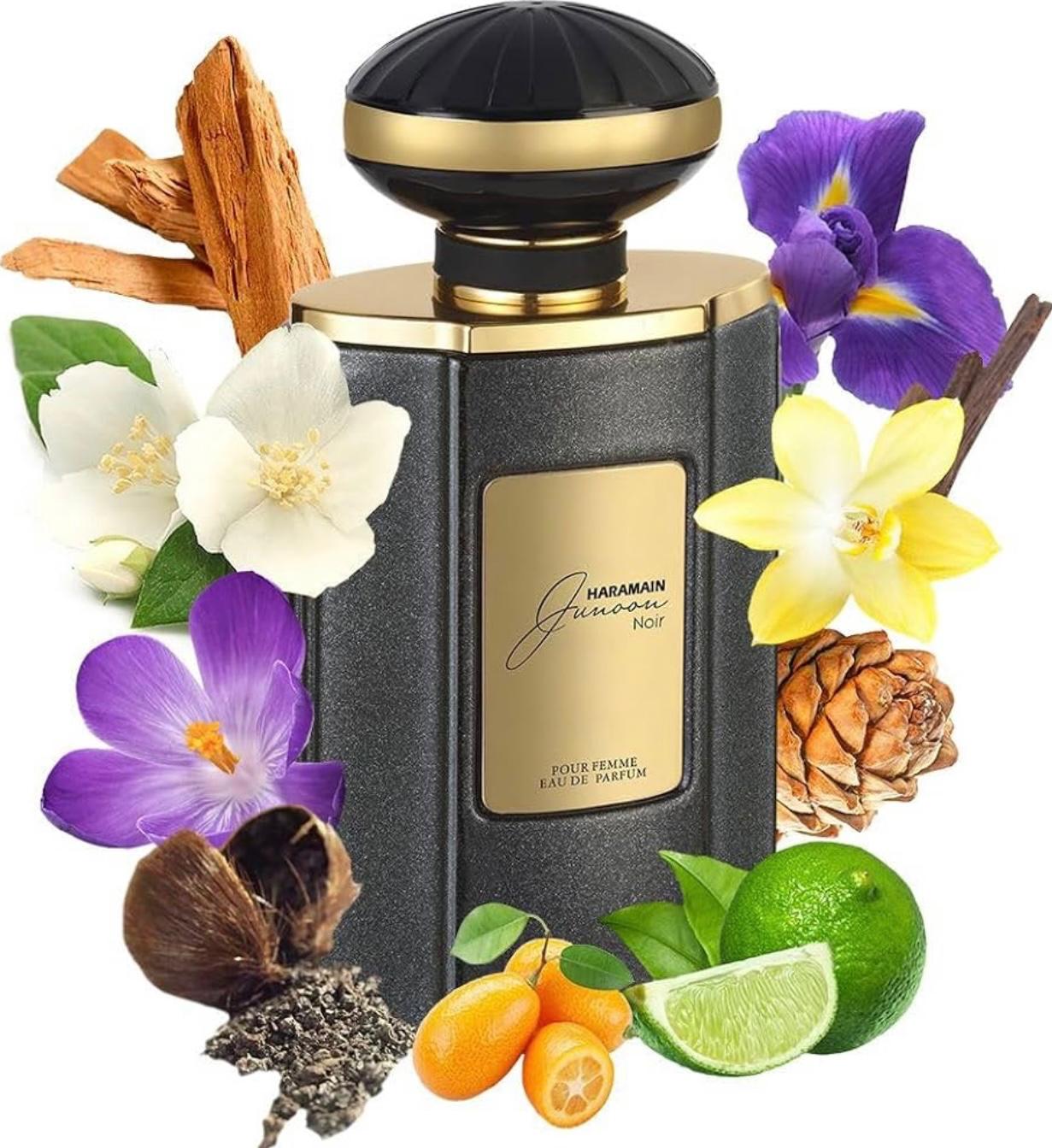 Junoon Noir de Al Haramain es una fragancia envolvente y sofisticada que combina elegancia moderna con un toque de misterio oriental. Su composición abre con una fresca explosión de kumquat y lima, aportando un inicio vibrante y chispeante. El corazón floral revela la suavidad de la raíz de lirio, la delicadeza de la violeta y la feminidad del jazmín y el lirio de los valles, creando una estela empolvada y refinada. Finalmente, su fondo cálido de vainilla, almizcle, sándalo y cedro deja una huella duradera, sensual y elegante sobre la piel