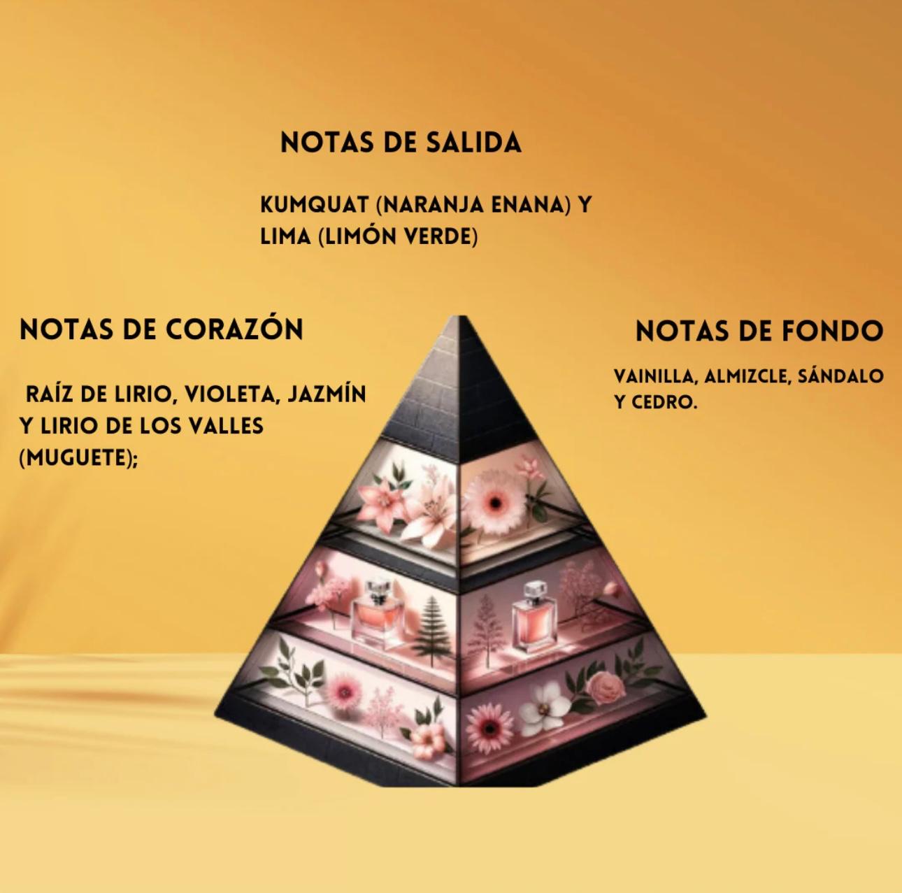 🌸Salidas: kumquat y lima / lima-verdosa. 🌸Corazón:raíz de lirio (orris/iris), violeta, jazmín y lirio de los valles o 🌸Fondo: vainilla, almizcle, sándalo y cedro