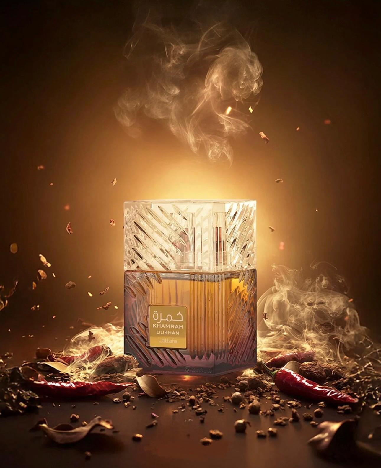 Khamrah Dukhan es una fragancia unisex con carácter audaz que mezcla lo fumado con lo dulce-especiado. Abre con una chispa picante de mandarina, pimiento y especias ahumadas; se adentra en un corazón resinosa y floral con incienso y pachulí; y se asienta sobre una base cálida y envolvente de tabaco, ámbar, tonka, praliné y benjuí. Ideal para quienes gustan de perfumes intensos con personalidad, especialmente en noches frescas o eventos donde quieres dejar huella Tiene una duración bastante buena: se reporta que dura 8-12 horas en muchos casos (en la piel), y más tiempo cuando se rocía en la ropa.