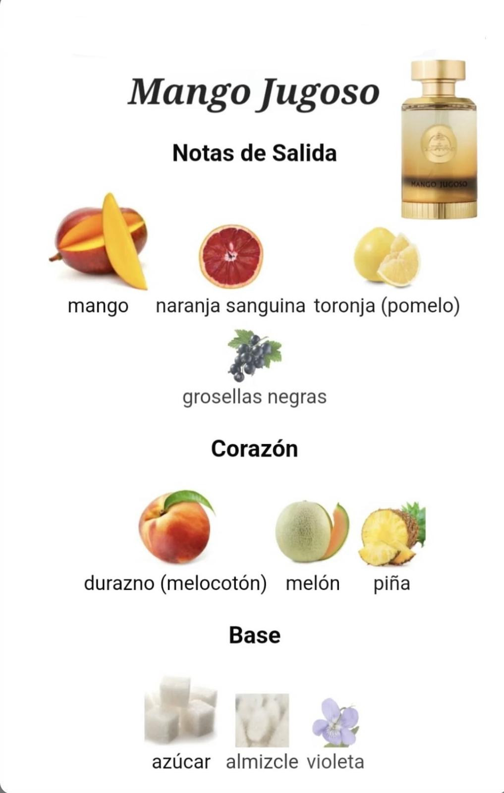 ⏳Mango Jugoso ofrece una duración de 6–8 horas en la piel. Su proyección es moderada a intensa, dejando una estela frutal, dulce y refrescante que destaca sin resultar pesada.