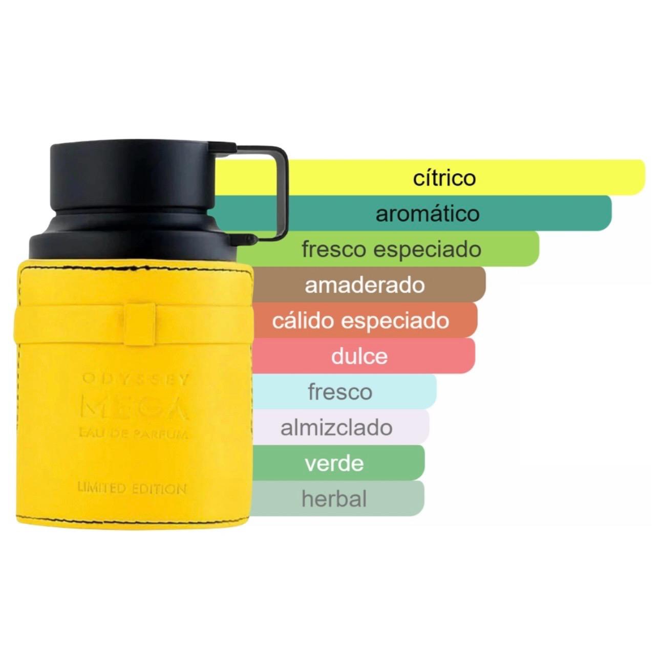 Odyssey Mega es una fragancia amaderada-aromática que equilibra frescura y calidez. Se abre con un estallido cítrico de naranja, bergamota, limón, jengibre y menta que aporta energía. Su corazón mezcla piña, geranio, enebro y salvia para un toque frutal y verde, mientras que la base de haba tonka, cedro, vetiver y almizcle deja un rastro elegante y masculino.